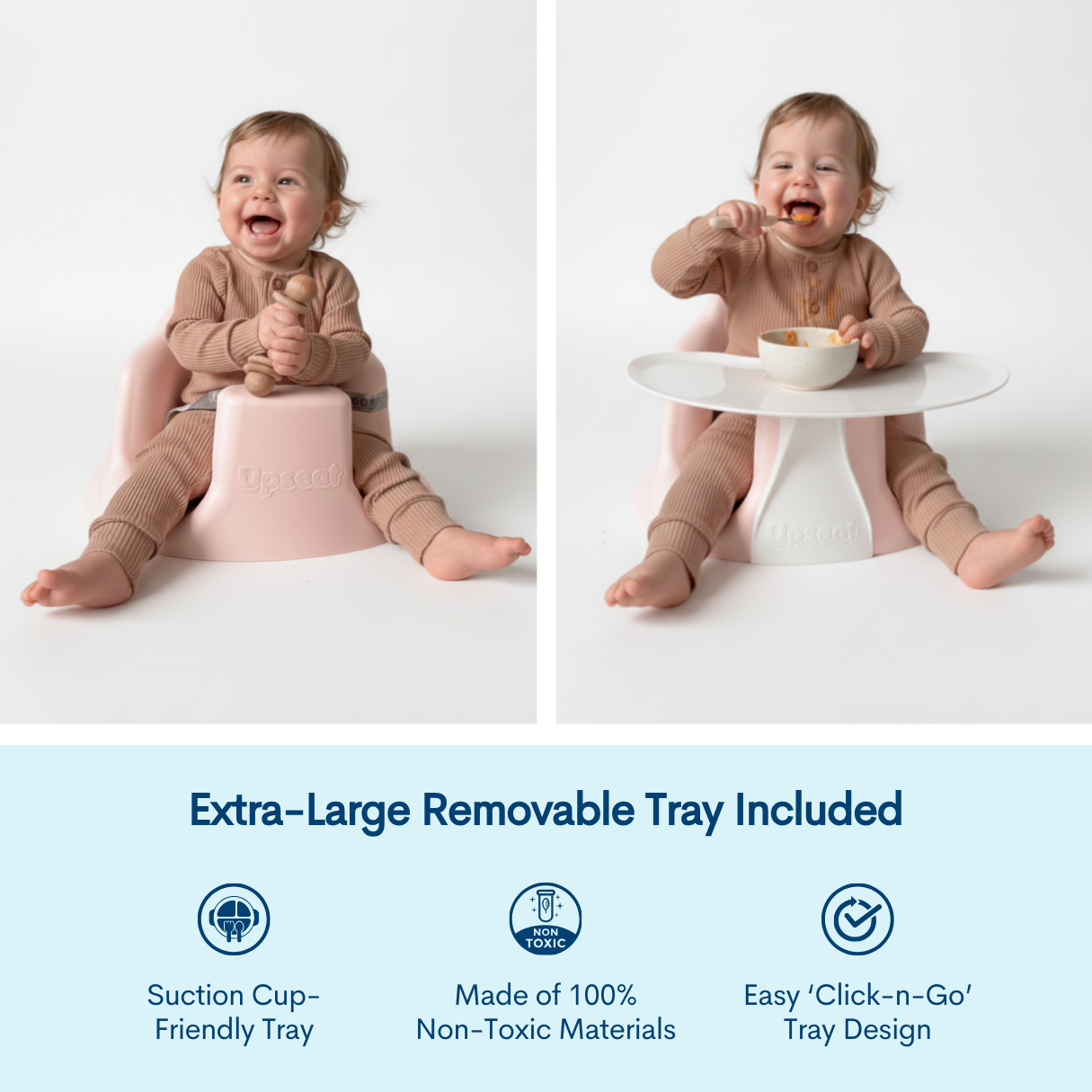 Each Upseat comes with a safety harness strap, a large tray, and booster seat conversion straps, at no extra cost.